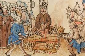 Meanwhile, an intermittent but brutal dynastic war raged between England and France for more than a century, from 1337 until 1453, from which it later became known as the Hundred Years’ War. It was launched by Edward III of England, who had a strong claim (through his mother, a French princess) to inherit the French throne, a claim pursued by his successors down to his great-great grandson, Henry VI. Again and again the English came close to their objective but it always slipped away, most famously when Henry V won a colossal victory against the French at Agincourt in 1415, but then in 1429 an illiterate peasant girl and visionary mystic called Joan of Arc, aged 17, succeeded in turning around the morale and military fortunes of the French. However, she was captured in 1430, and the French king refused to ransom her. Her captors then sold her to the English, who had a Church court try her for heresy, and burned her at the stake (1431). Major elements in the Church’s case against Joan at her trial were: (1) as the leader of the French army, on the battlefield and off it, she wore men’s clothing and armor; (2) she said that she had heavenly visions in which she received God’s instructions from saints and angels; (3) she refused to accept her prosecutors’ instruction that her masculine clothing was unacceptable, and that her visions were demonic, not angelic. Joan’s insistence that she was right, contrary to the Church court’s command of both religious doctrine and canon law, lay at the heart of the case, and symbolizes some of the broad political, cultural, and religious movements of the late Middle Ages.